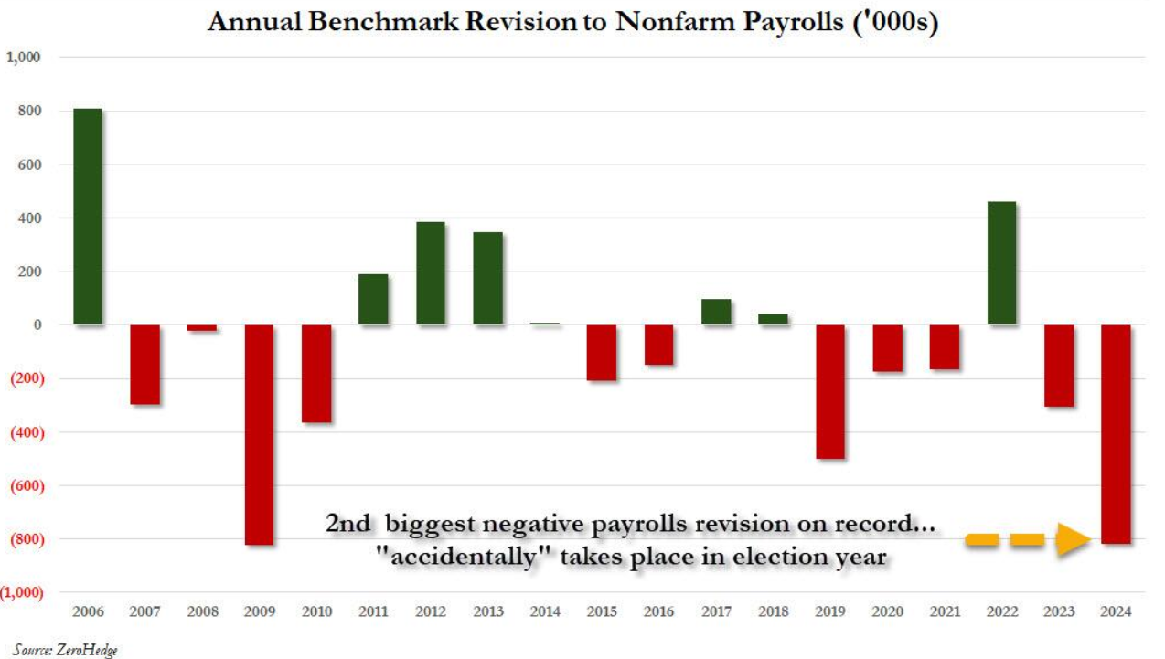 2024年8月发布的初步修订显示,2023年4月至2024年3月期间创造的就业岗位比之前报告的机构数量下修了惊人的81.8万个(有记录以来的第二大负修正,美联储仅在几周后就将其作为恐慌性降息50个基点的理由,这也恰好发生在大选年)。